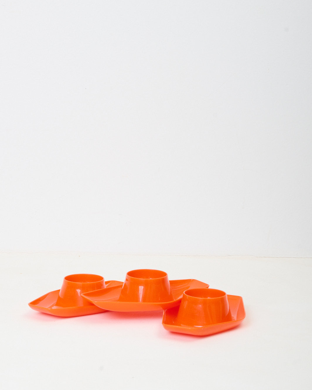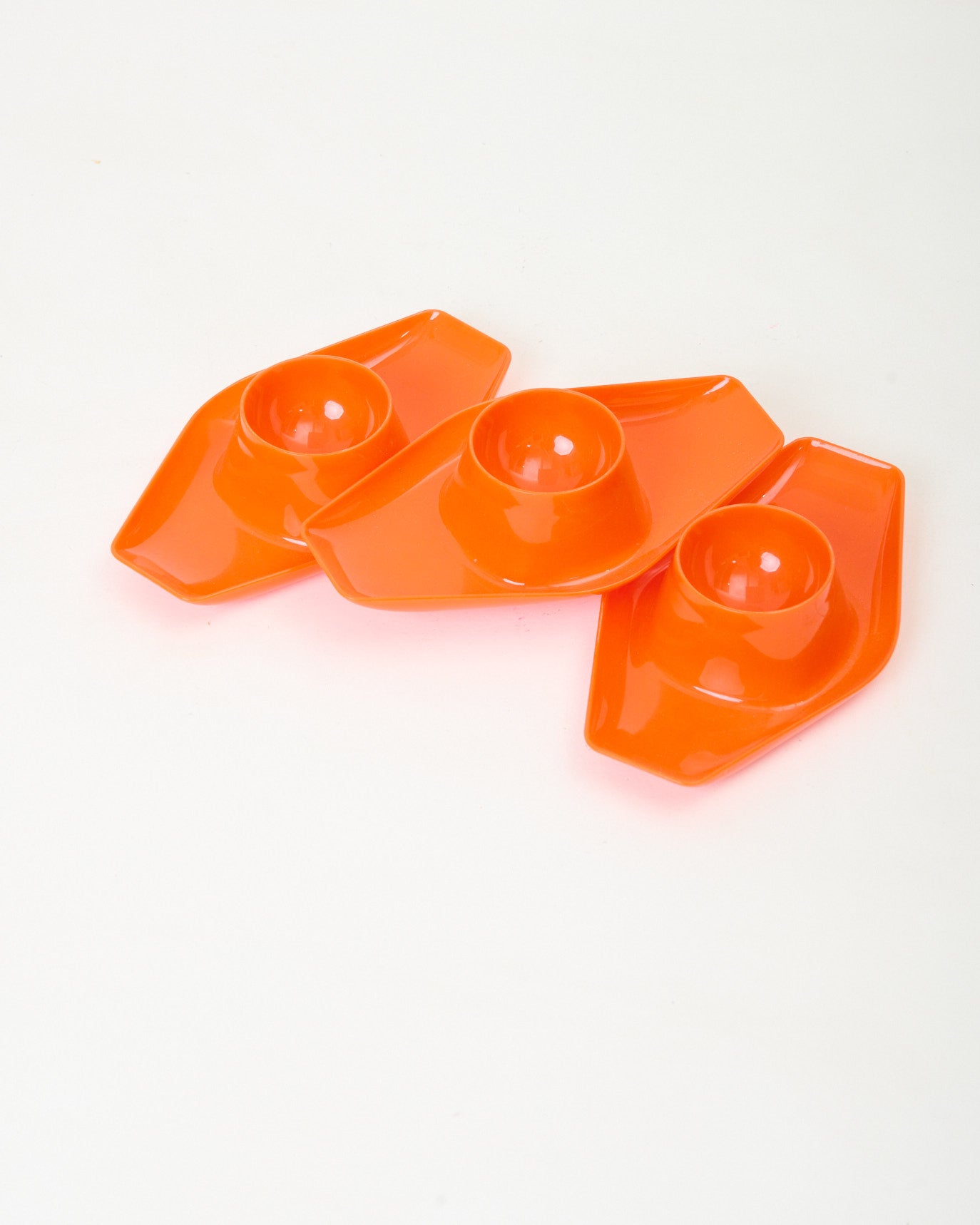 Trois coquetiers en plastique orange de forme ovale. Des années 70.