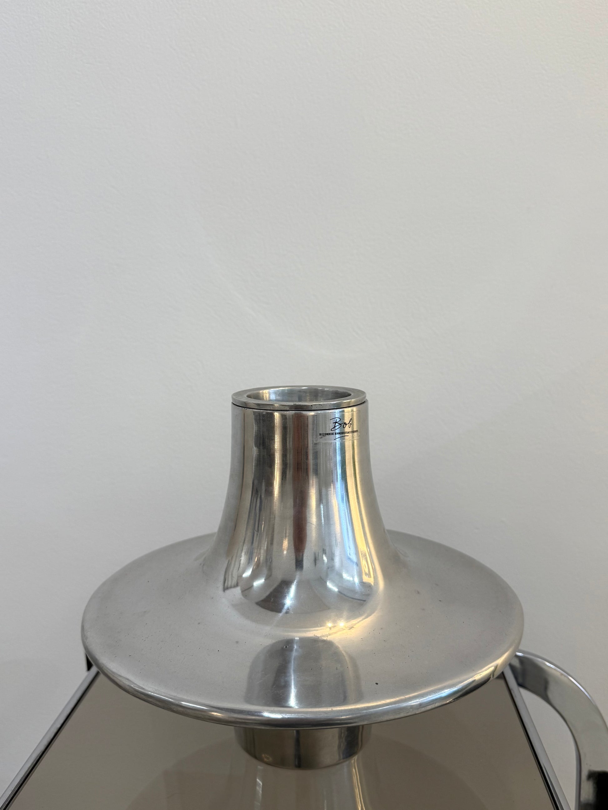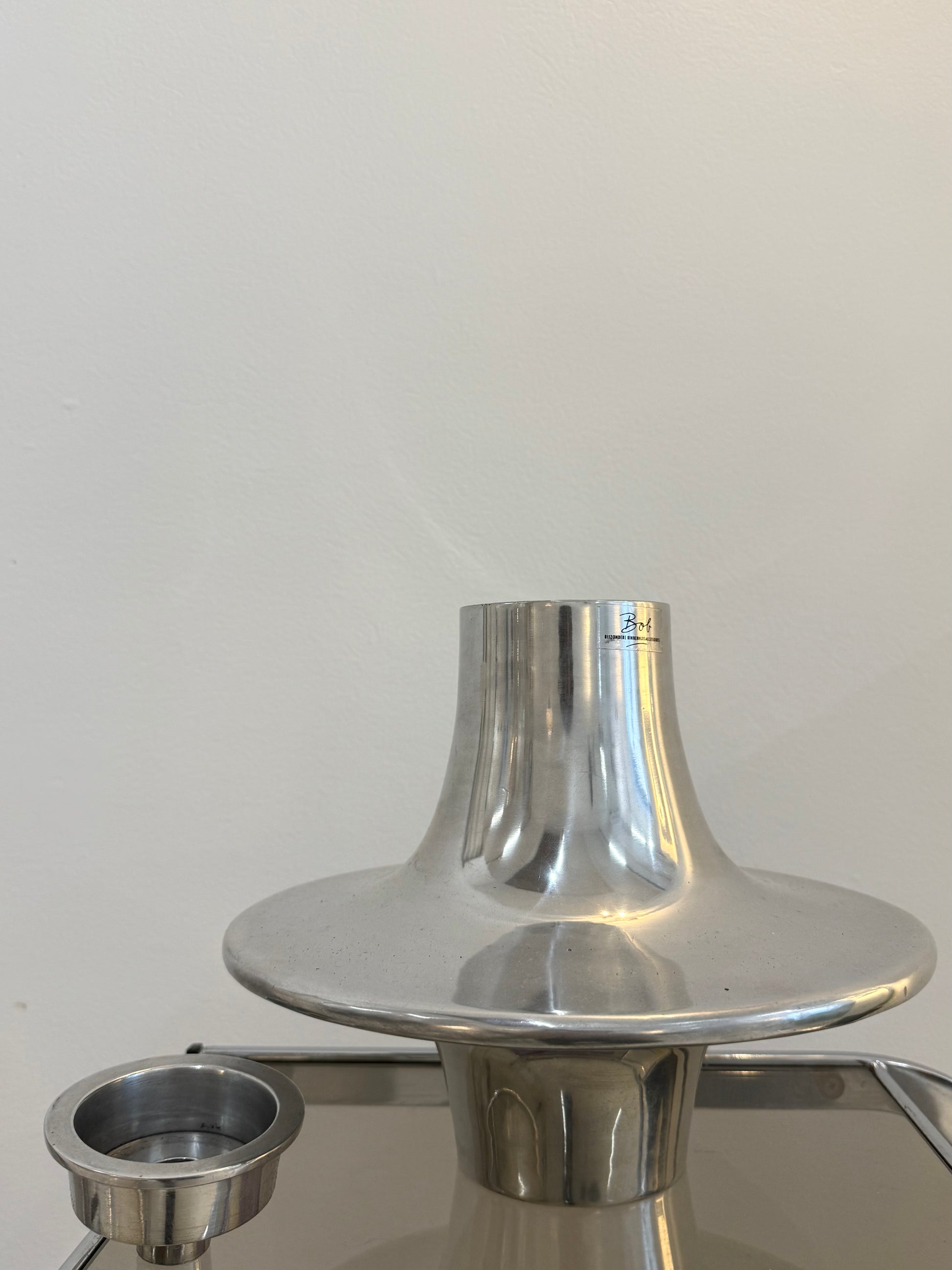 Vase et bougeoir "Bob" par Bijzondere Binnenhuisaccessoires dans les années 80. Forme Space age. L'empiècement supérieur qui forme le bougeoir peut être retiré pour que l'objet soit utilisé en vase. Très bel état.